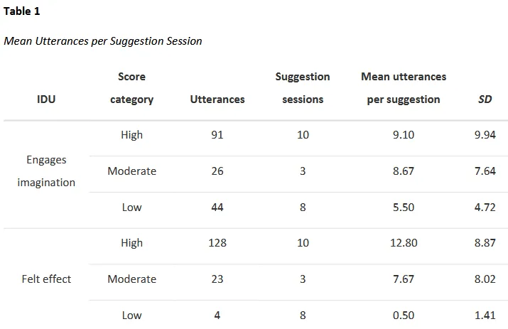The generic diachronic analysis revealed that within each suggestion, the participants appeared to report experiences that were chronologically quite similar. In general, they may have had some initial thoughts, were then likely to have engaged their imagination, then usually felt some kind of effect. The participants with low scores did not appear to differ chronologically in any great capacity (other than whether they felt the effect) from those with moderate or high scores. There was no evidence, in the generic diachronic analysis, of participants with low scores actively sabotaging their experience in order to prevent the suggested effects; in specific terms, the responses from those with low scores did not appear to include extra phases that would be detrimental to their response.