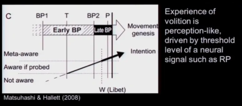 While this was happening - Libet was also recording on an EEG. The readiness potential (from Libet’s view) was a signal preceding voluntary action. The W (will) judgement is the moment of conscious intention. Preparation appears to happen before you were aware of the intention.