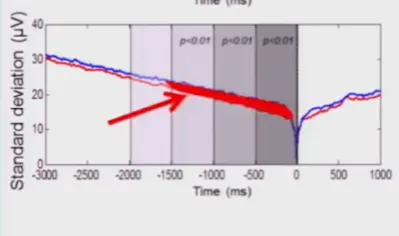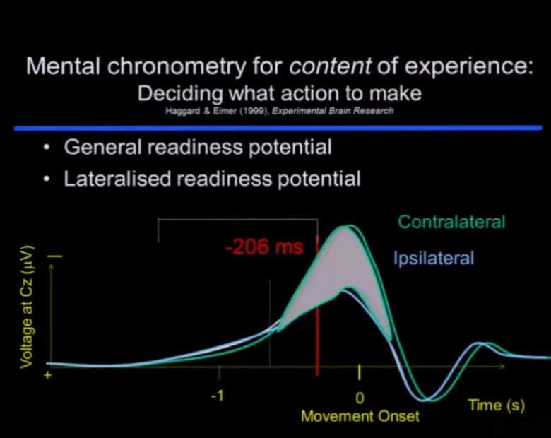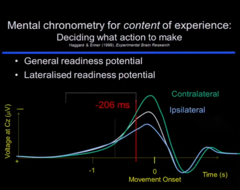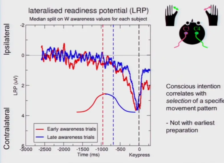 More research - this time, it’s twice as exciting! You can see a contralateral shift late awareness potentials. This might be about deciding the specific intention of pushing the button, not about sitting down and doing the boring experiment.
