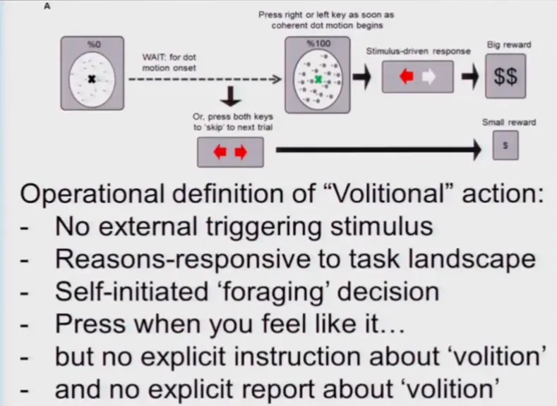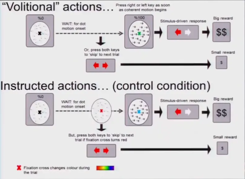 The control condition is that the dot will change to red, and you’re supposed to hit both at the same time. This is stimulus driven. So now they can tease out volitional actions.